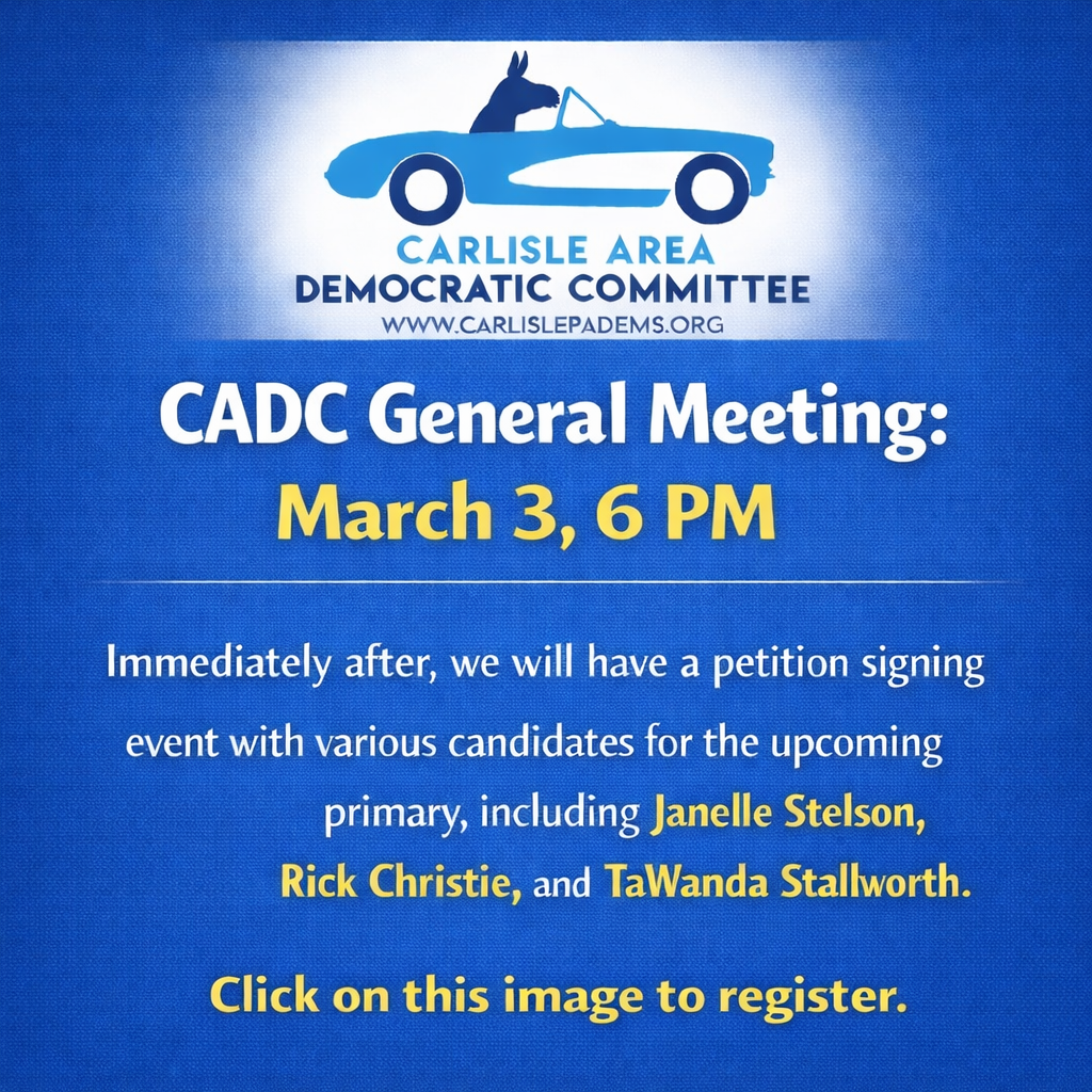 The mission of the Carlisle Democrats is to support Democratic Candidates in the Carlisle Area. To better achieve that goal, we’re asking you, our community, for feedback. Please click here to complete our Community Survey. It's quick to do and very helpful to us. Thanks!